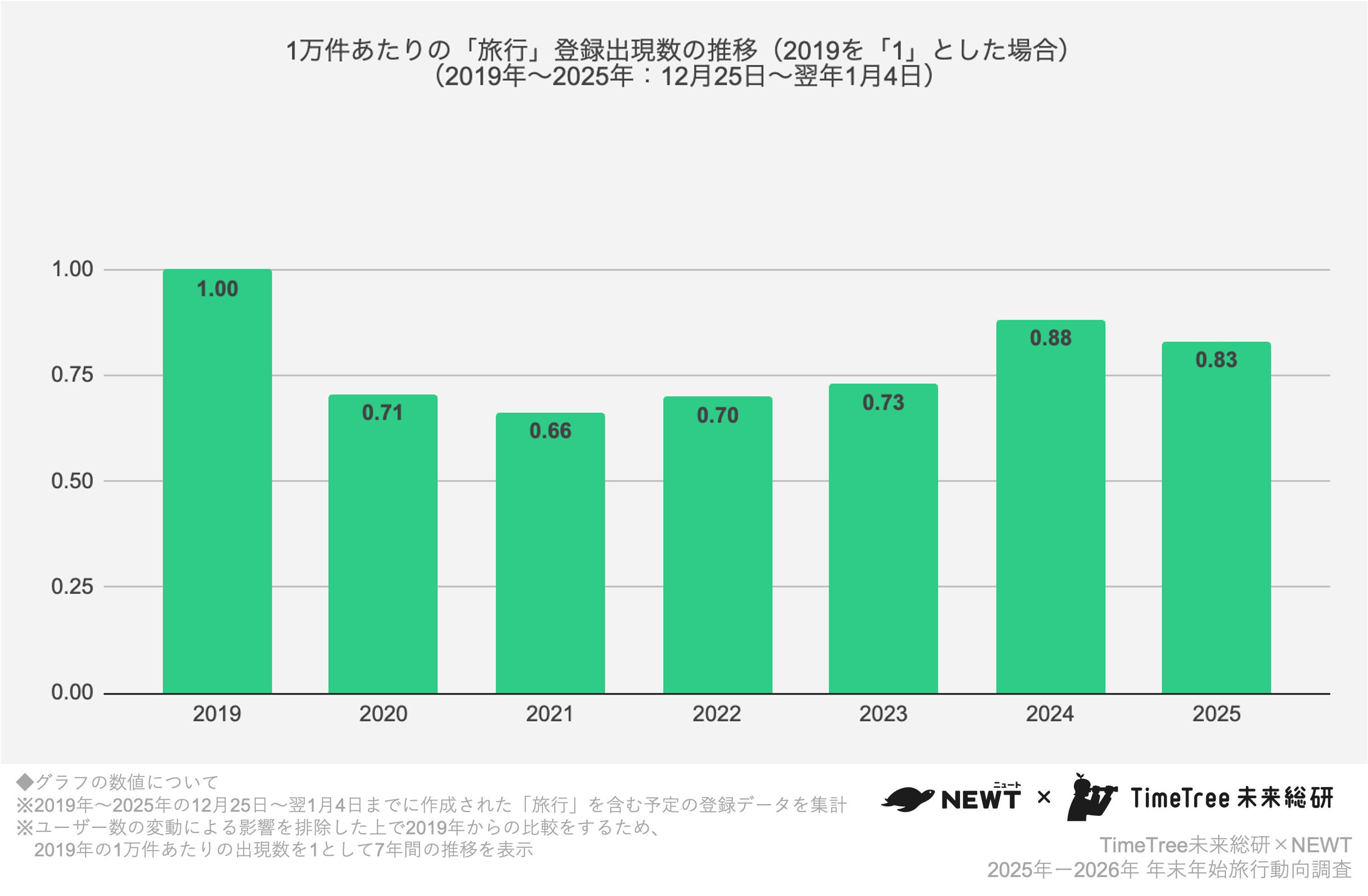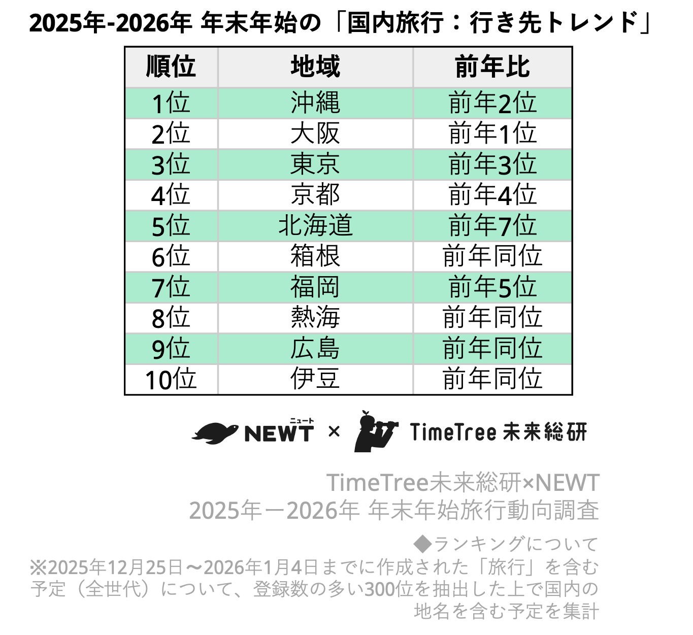 株式会社TimeTree(本社:東京都新宿区、代表取締役社長:深川 泰斗)の社内研究所『TimeTree未来総合研究所』(https://timetreeapp.com/intl/ja/future-research-institute)と株式会社令和トラベル(本社:東京都渋谷区、代表取締役:篠塚 孝哉)が運営する、かしこい、おトク、旅行アプリ『NEWT(ニュート)』は、共同で2025年〜2026年・年末年始の旅行動向を分析しました。TimeTree未来総研は、年末年始(2025年12月25日〜2026年1月4日)に登録された「旅行」を含む予定データを分析し、旅行アプリ『NEWT』は同アプリにおける予約データを解析しました。
