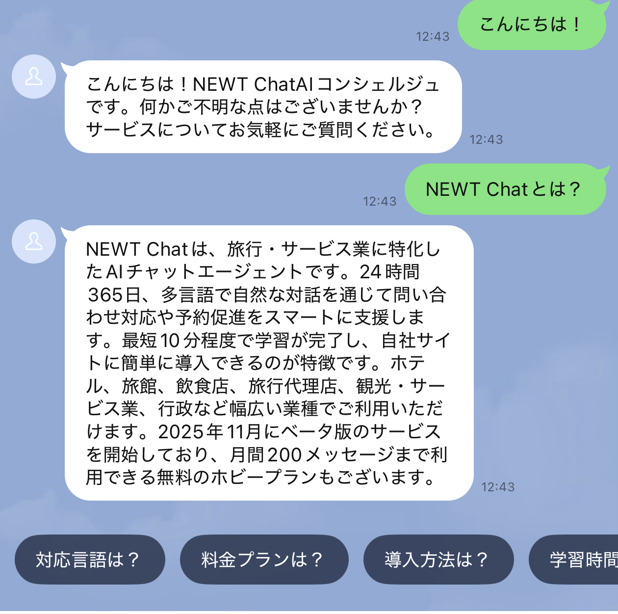 かしこい、おトク、旅行アプリ『NEWT(ニュート)』が提供する、旅行・サービス業に特化したAIエージェントチャット「NEWT Chat(ニュートチャット)」は、新たにLINE公式アカウントとの連携機能を提供開始しました。