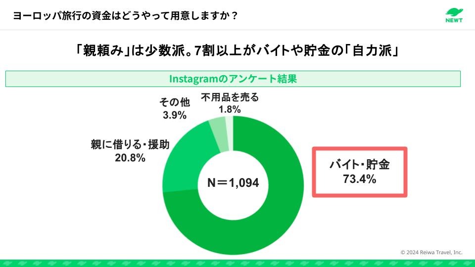 しかし、「高いから諦める」のではなく、「どう実現するか」に行動をシフトしているのが2026年の特徴です。旅行資金の調達方法では、「バイト・貯金(73.4%)」が圧倒的多数を占め、「親に借りる・援助(20.8%)」を大きく引き離しました。「不用品を売る(1.8%)」などの工夫を含めると、4人に3人が自力調達で渡航を実現しようとしています。学生にとってヨーロッパ旅行は、ただ与えられるものではなく、自らの手で計画し掴み取る、より『価値ある体験』となっているようです。